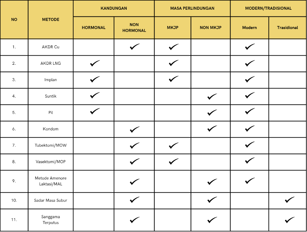 Metode kontrasepsi dibagi menjadi tiga yaitu berdasarkan kandungan, masa perlindungan, dan cara modern dan tradisional. Metode kontrasepsi yang digunakan dalam program pemerintah adalah berdasarkan masa perlindungan, yaitu Metode Kontrasepsi Jangka Panjang (MKJP) dan non Metode Kontrasepsi Jangka Panjang (non-MKJP).